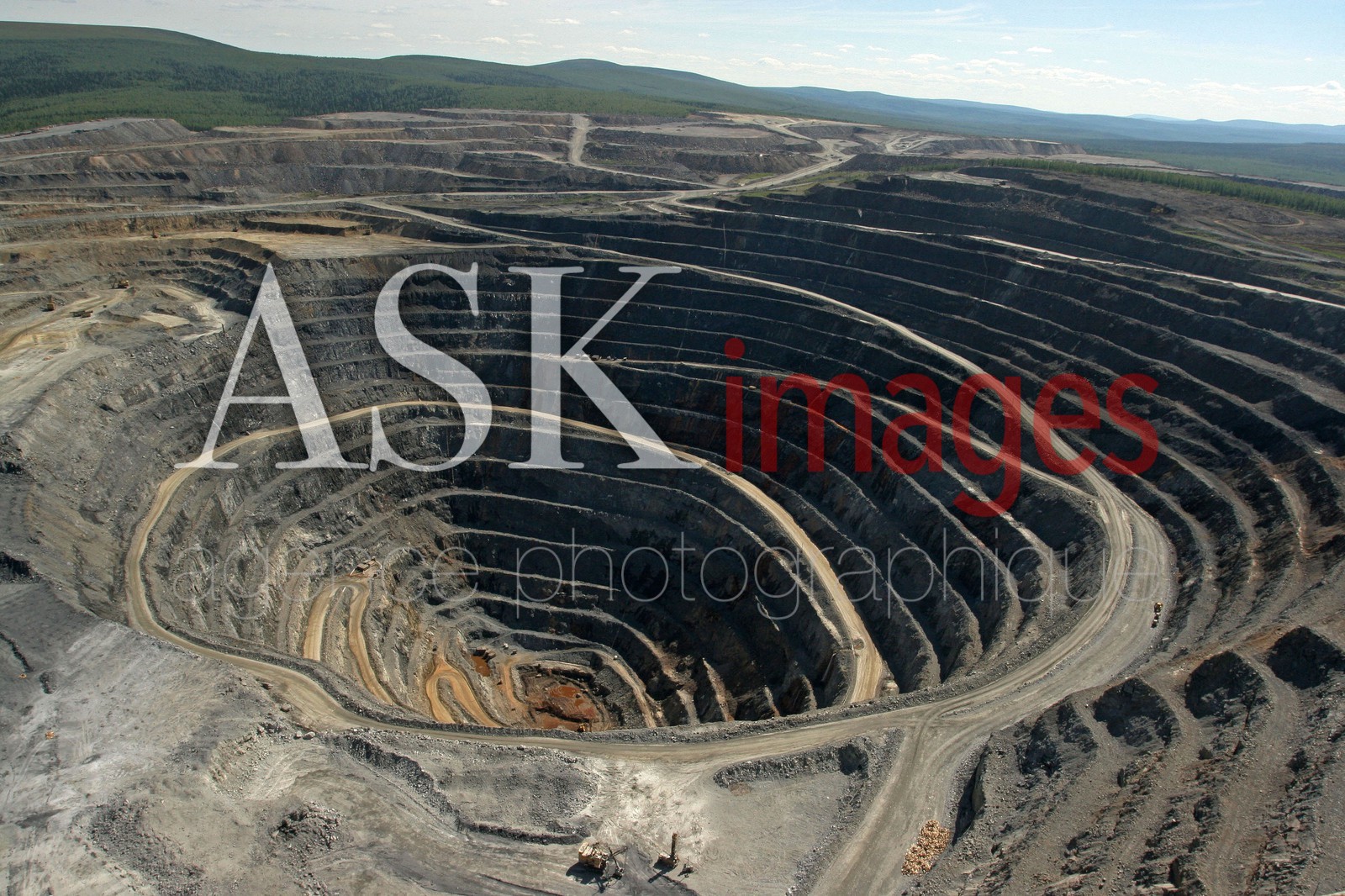 | Description | The 400-meter deep open pit of the Olimpiada golden mine, Severo-Yeniseisky district, Krasnoyarsk region, 500 km north of Krasnoyarsk, is seen from a helicopter. Olimpiada mine is owned by Russia's biggest gold producer, Polyus Gold, one of the Top Five gold mining companies in the world. |