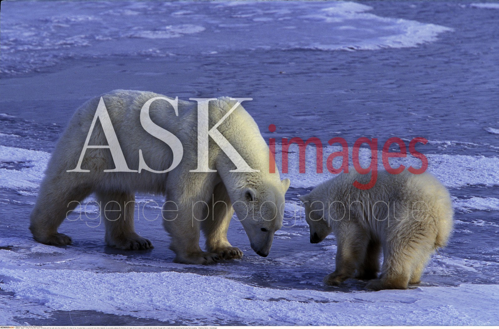 | Description | Bears. A Year in the Life. June. A female with her cubs tests the sturdiness of a sheet of ice. For polar bears a successful hunt often depends on accurately judging the thickness of a layer of ice or snow in order to be able to break through with a single pounce, preventing their prey from escaping. |