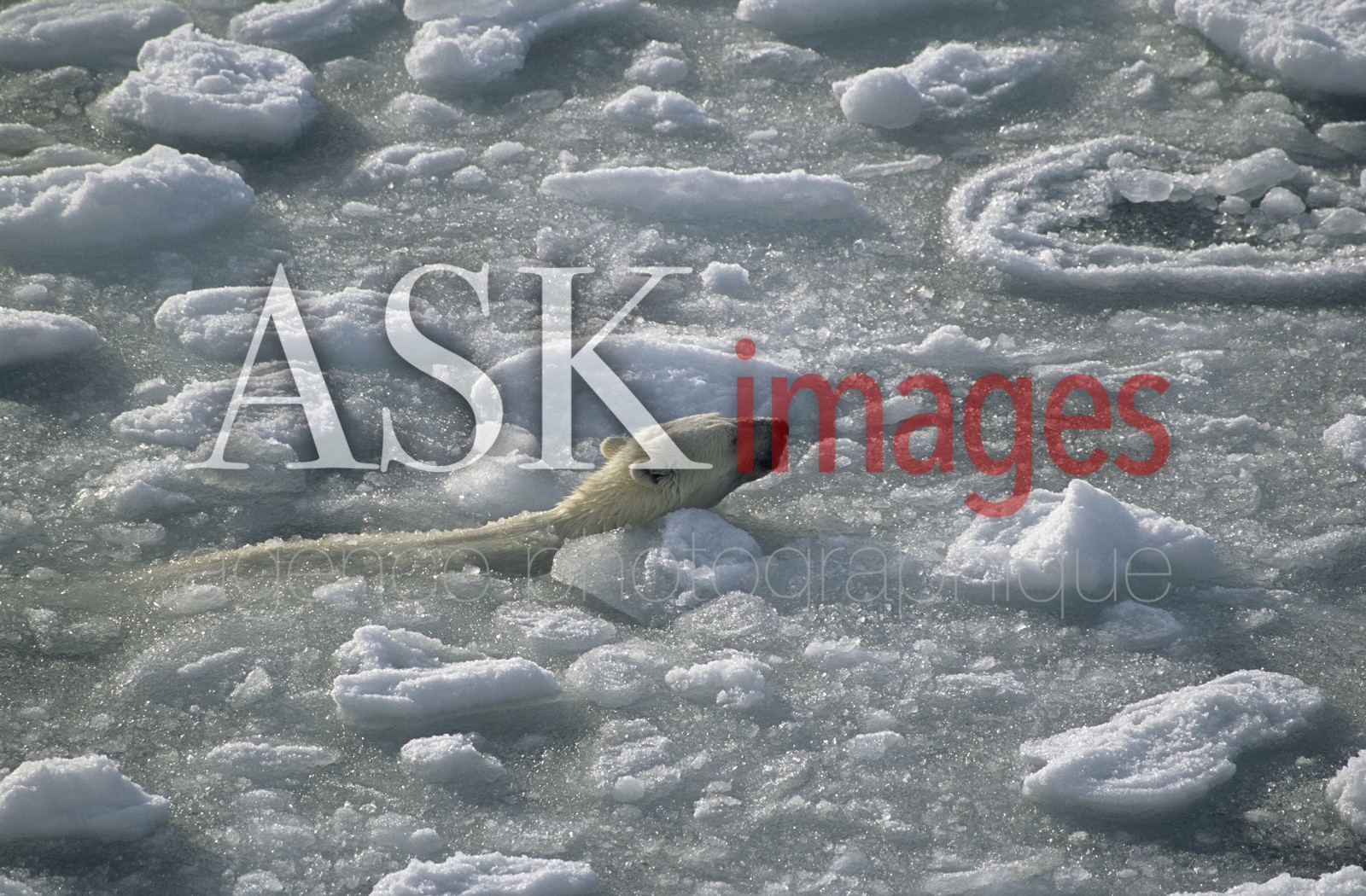 | Description | Female Polar Bear swimming amongst ice floes, in summer ice. Spitsbergen. Svalbard. |