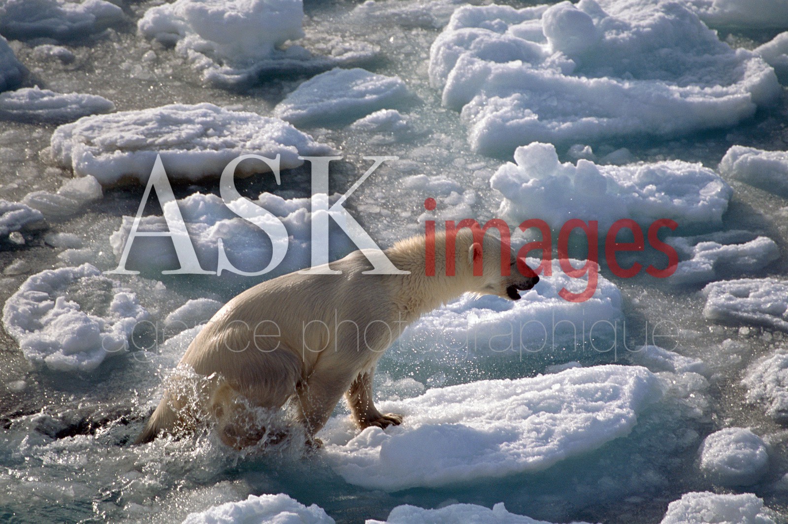 | Description | Female Polar Bear climbs out of the sea onto an ice floe, in summer ice. Spitsbergen. Svalbard. |