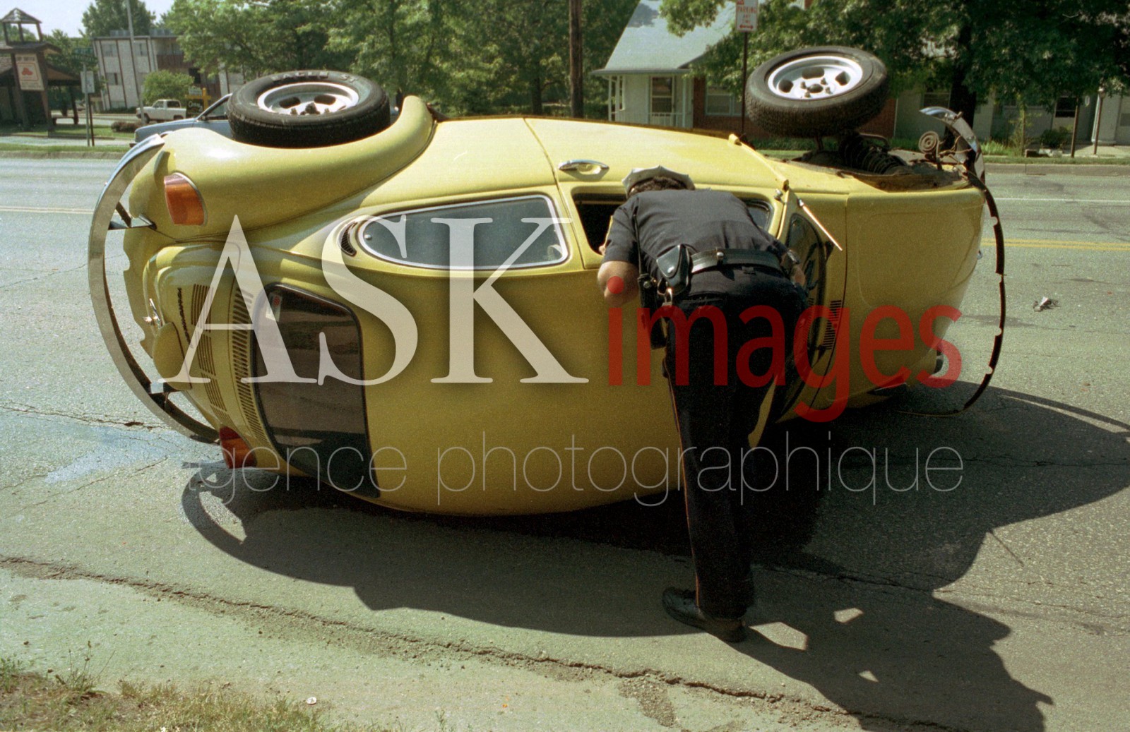 | Description | "Caption: Topeka, KS: A police officer peers inside a Volkswagon Beetle to survey the damage after the car rolled over on a city street. No one was injured in the accident. Photo: ª Amelia Kunhardt/The Image Works" |