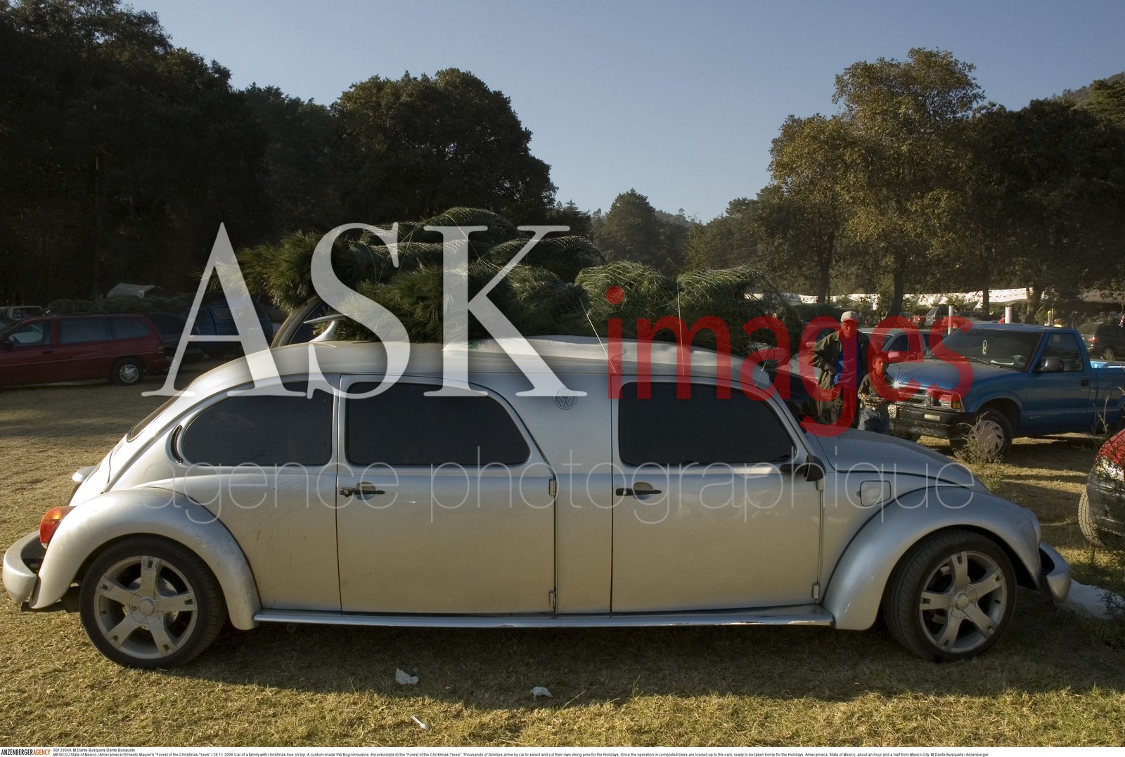 | Description | MEXICO / State of Mexico / Amecameca / Ernesto Maurer's "Forest of the Christmas Trees" / 26.11.2006.Car of a family with christmas tree on top: A custom-made VW Bug-limousine....© Dante Busquets / Anzenberger |