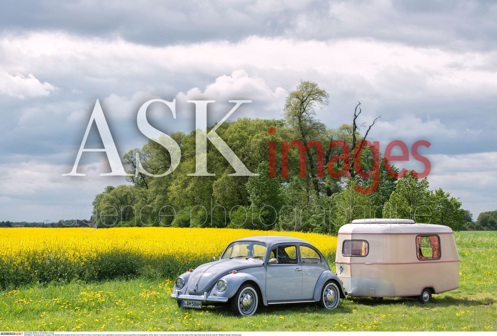 | Description | GERMANY / Brandenburg / Classic VW Beetle and caravan Eriba Puck (1961) on tour in Germany / Car registration numbers may be published, photographer is the owner. / Car and camping trailer on the edge of the rape field near federal road B 5. ..© Mario Weigt / Anzenberger |