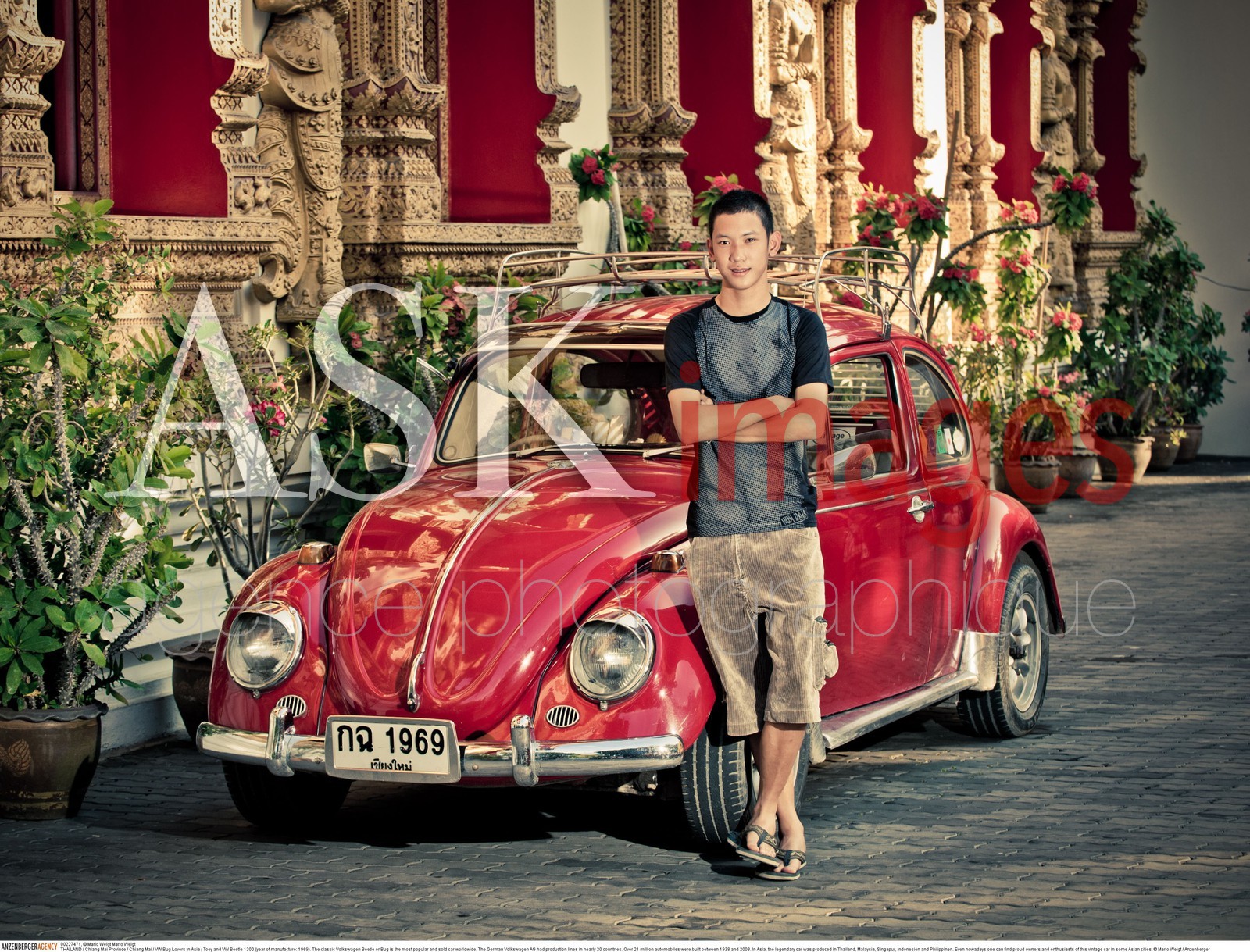 | Description | THAILAND / Chiang Mai Province / Chiang Mai / VW Bug Lovers in Asia / Toey and VW Beetle 1300 (year of manufacture: 1969)..The classic Volkswagen Beetle or Bug is the most popular and sold car worldwide. The German Volkswagen AG had production lines in nearly 20 countries. Over 21 million automobiles were built between 1938 and 2003. In Asia, the legendary car was produced in Thailand, Malaysia, Singapur, Indonesien and Philippinen. Even nowadays one can find proud owners and enthusiasts of this vintage car in some Asian cities. ..© Mario Weigt / Anzenberger.. |