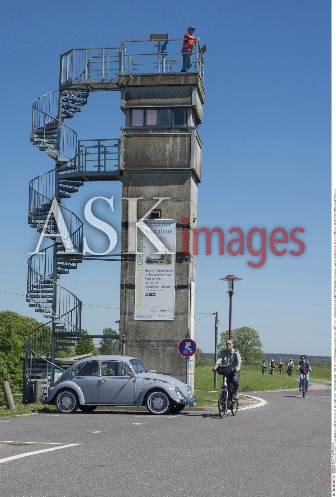 | Description | GERMANY / Brandenburg / Lenzen / Former East German watchtower BT 9 on the dike and Elbe Cycle Route which provides beautiful view over the Elbtalaue (riverside area, meadow of the valley of the Elbe River). Over a length of 94 km between Cumlosen and Lauenburg, the Elbe was the border river of the inner German division. ..© Mario Weigt / Anzenberger |