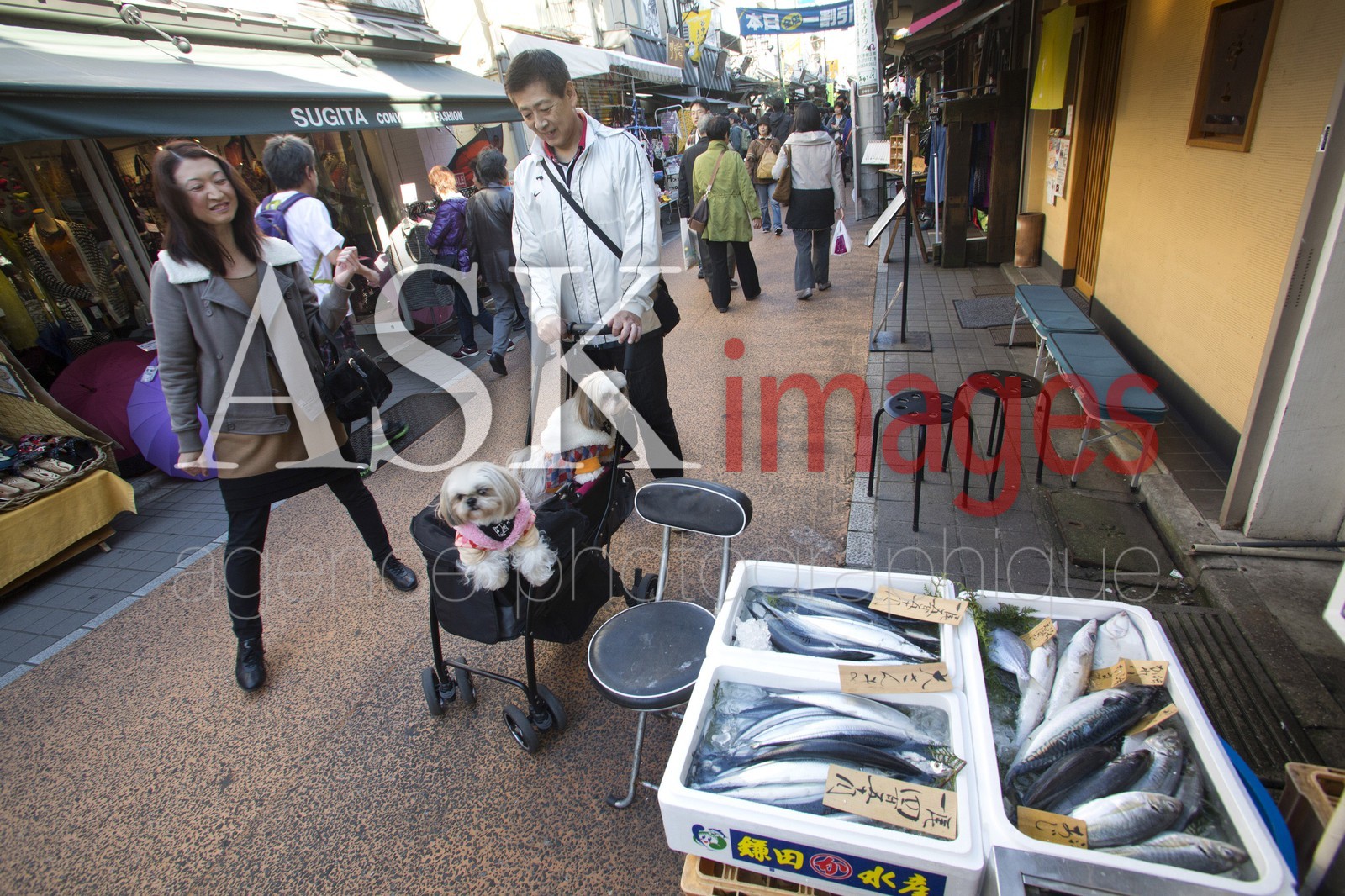Street life, couple with dogs in small street