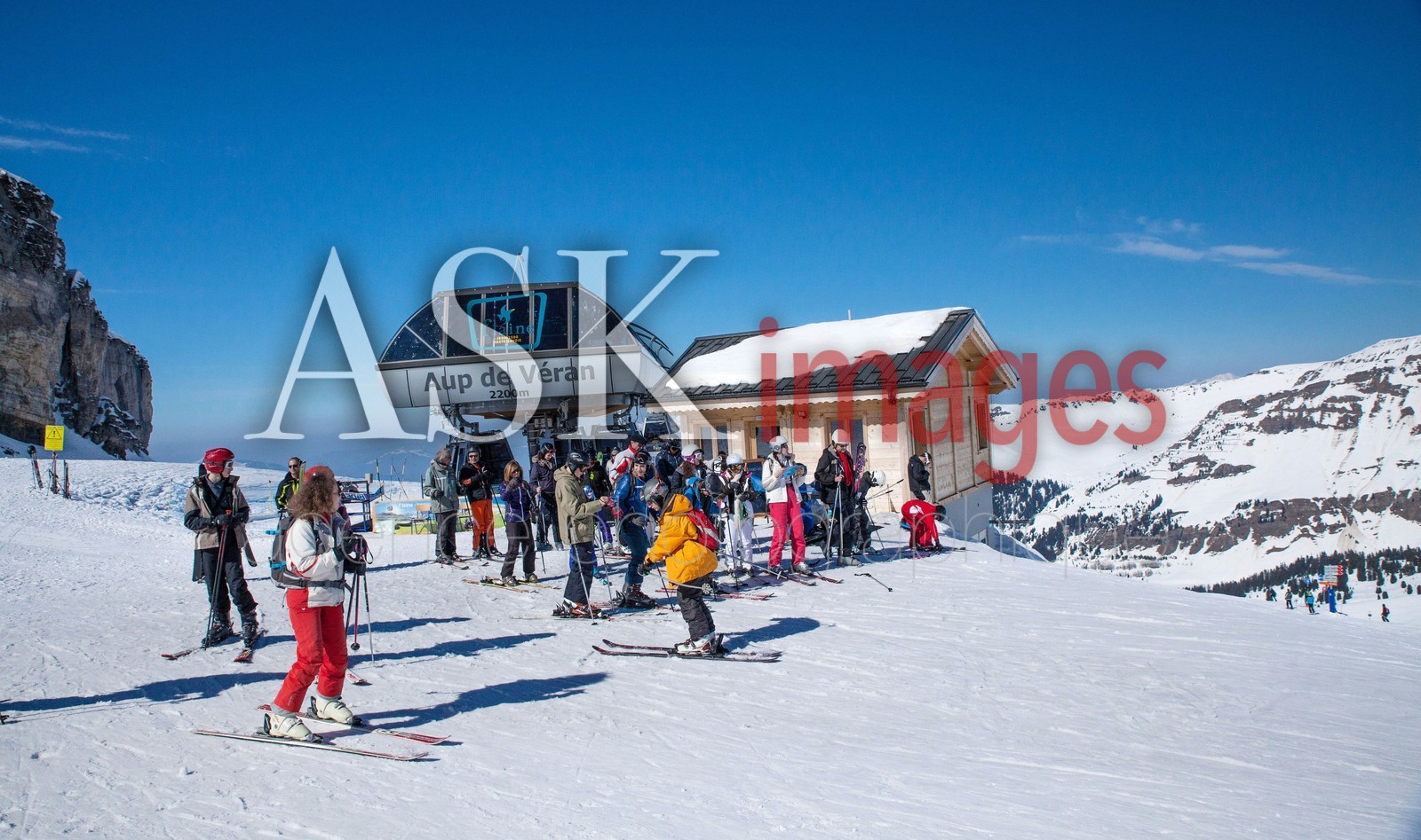 Haute-Savoie, Flaine, skiers at cablecar station