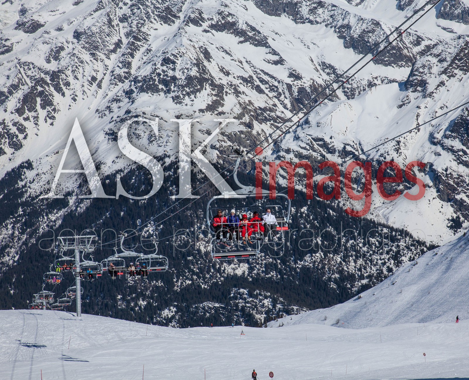 Contamines-Montjoie, skiers on chair lift.