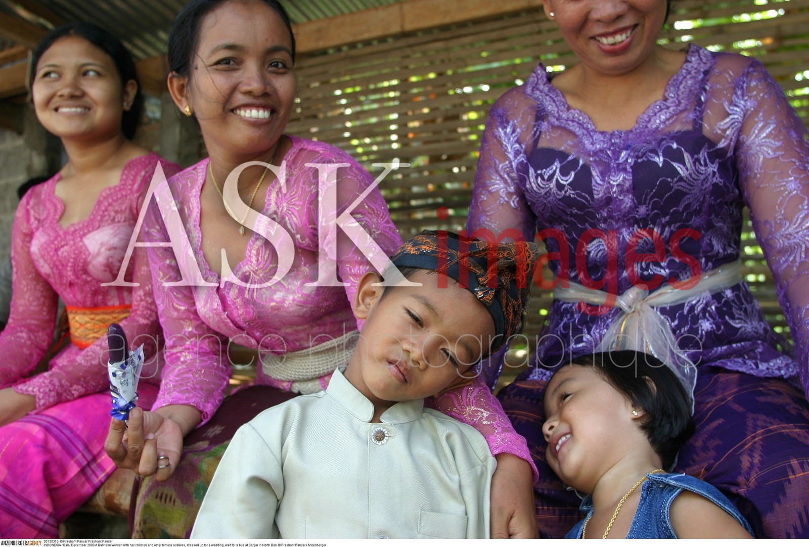 | Description | INDONESIA / Bali / .A Balinese woman with her children and other female relatives, dressed up for a wedding, wait for a bus at Banjar in North Bali......© Prashant Panjiar / Anzenberger |