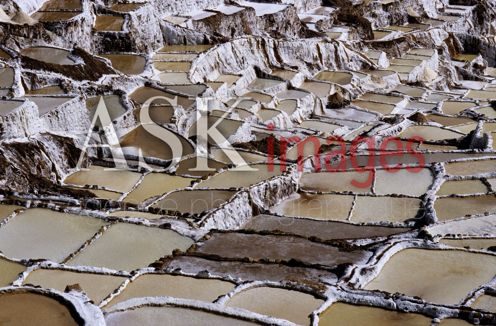 | Description | PERU / Cusco / Urubamba Valley / Maras / Salineras de Maras / Salt extraction from salty river at salt evaporation ponds |