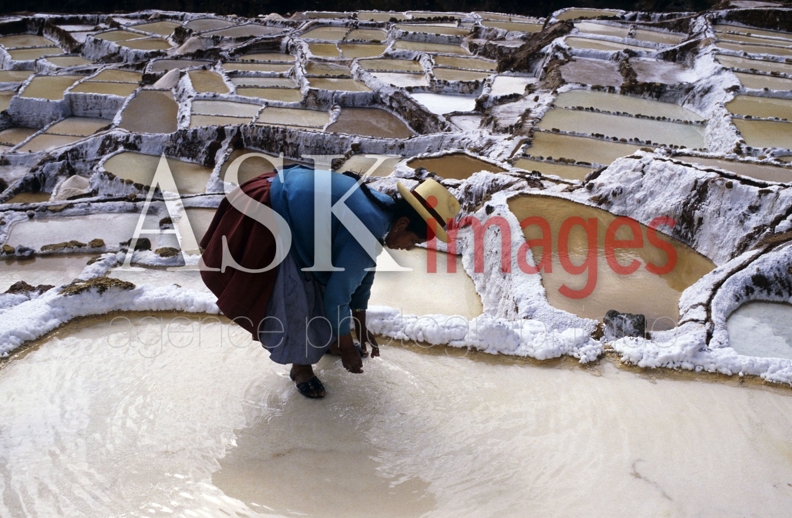 | Description | PERU / Cusco / Urubamba Valley / Maras / Salineras de Maras / Salt extraction from salty river at salt evaporation ponds |