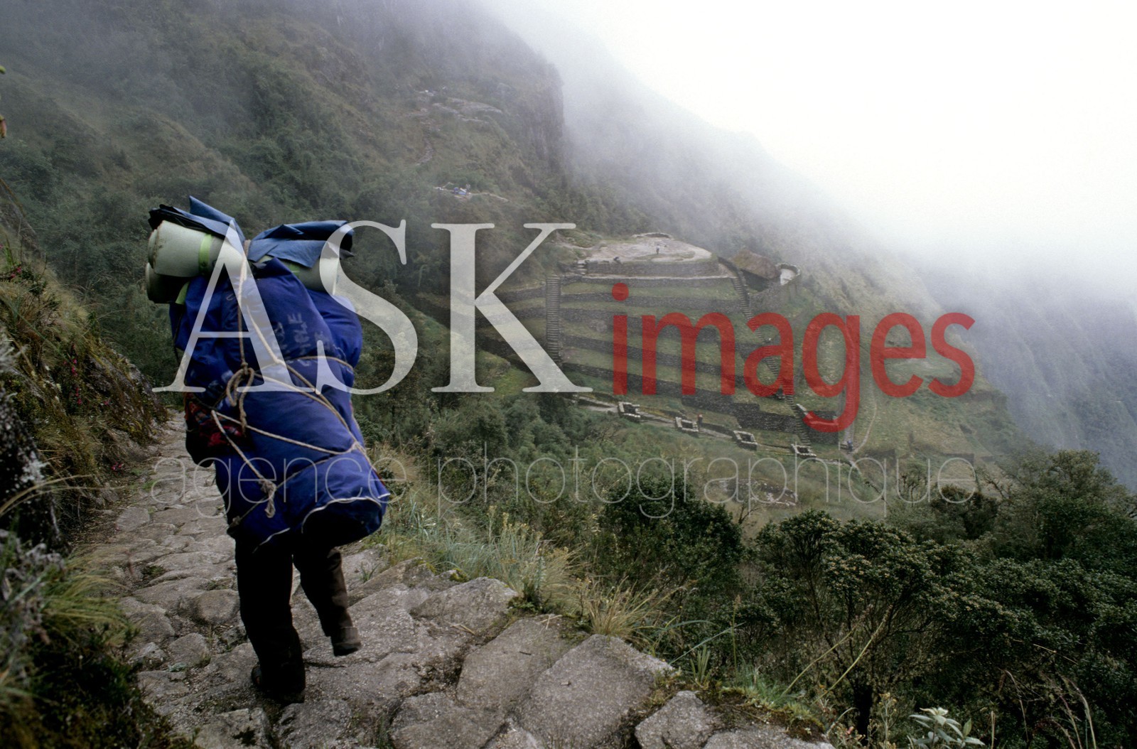 Peru, Cusco, Inca trail, Phuyupatamarka ruins, bearer
