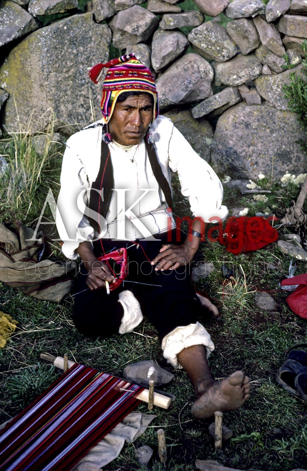 PERU / Puno / Lake Titicaca / Taquile Island / Quechua man/weaving