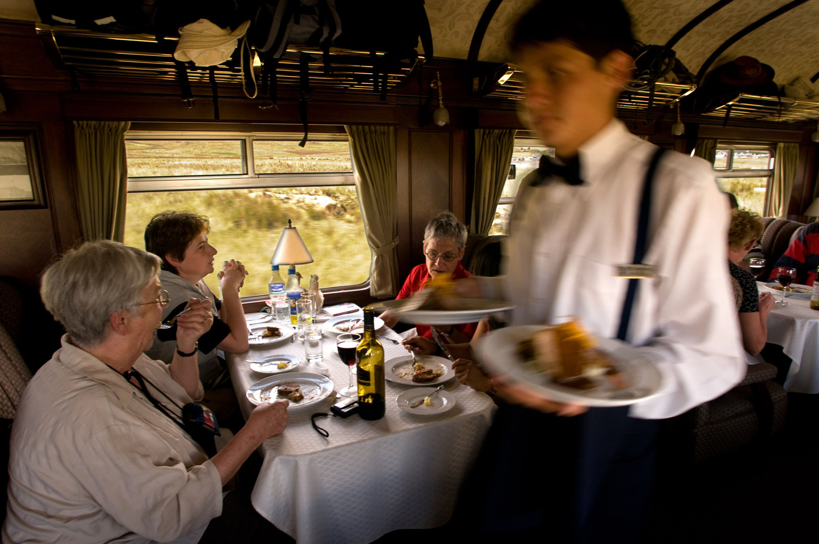 | Description | Andean Explorer, luxury train from Cusco to Puno, Train inside, The waiters serve delicacies in the Andean Explorer train Orient Express which runs between Cuzco and Puno. |