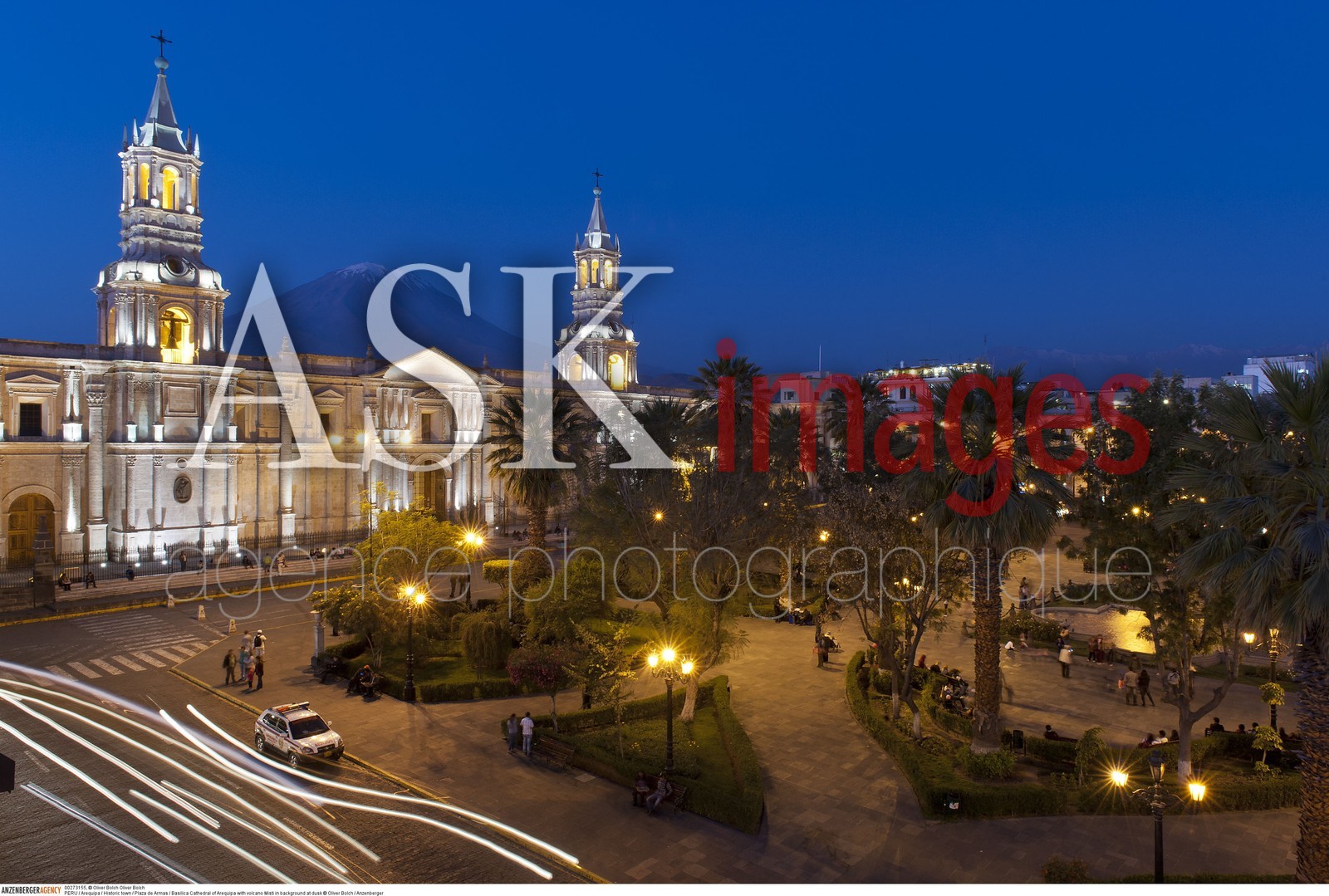 | Description | PERU / Arequipa / Historic town / Plaza de Armas / Basilica Cathedral of Arequipa with volcano Misti in background at dusk..© Oliver Bolch / Anzenberger |