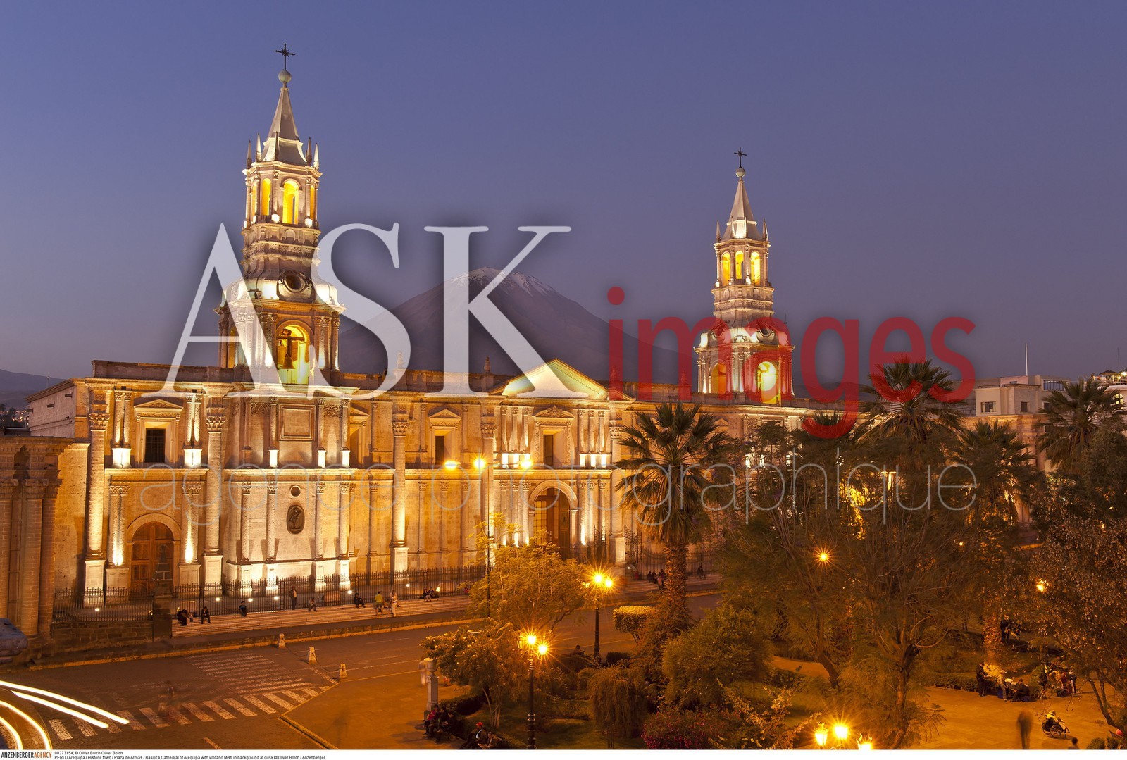 | Description | PERU / Arequipa / Historic town / Plaza de Armas / Basilica Cathedral of Arequipa with volcano Misti in background at dusk..© Oliver Bolch / Anzenberger |