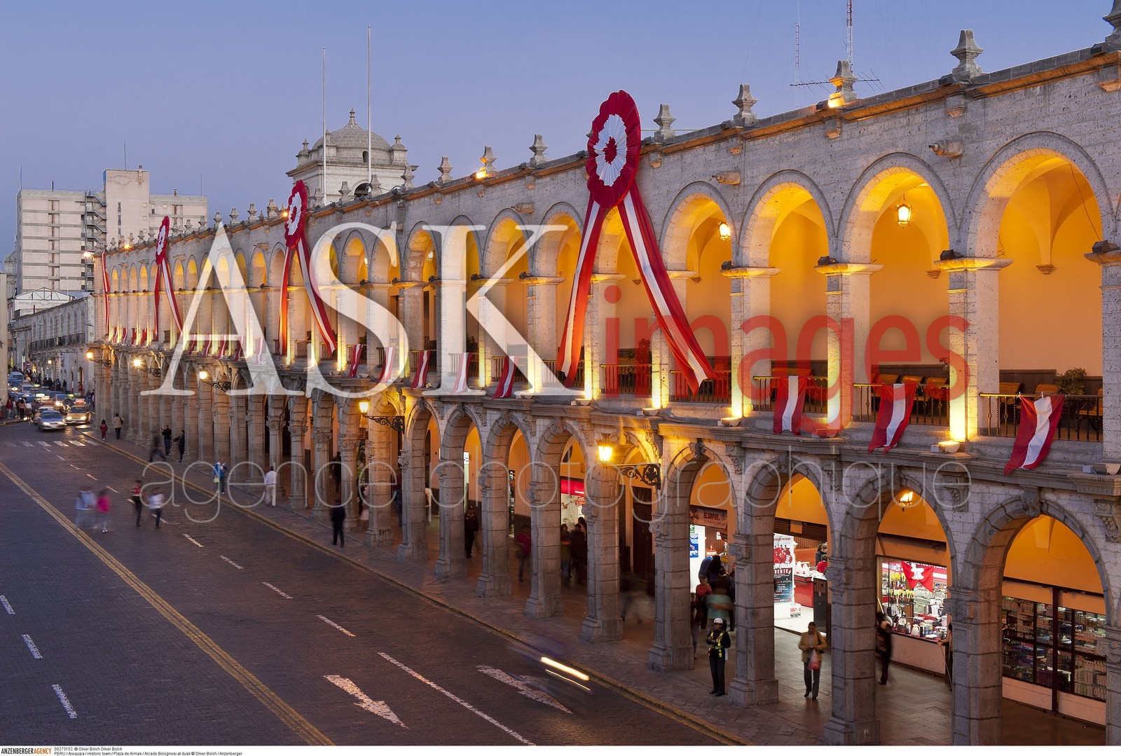 | Description | PERU / Arequipa / Historic town / Plaza de Armas / Arcade Bolognesi at dusk..© Oliver Bolch / Anzenberger |