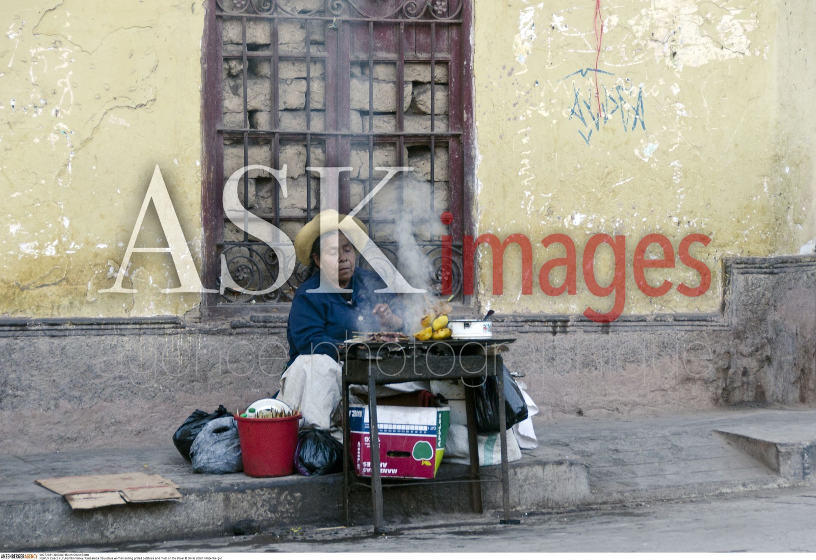 | Description | PERU / Cusco / Urubamba Valley / Urubamba / Quechua woman selling grilled potatoes and meat on the street..© Oliver Bolch / Anzenberger |
