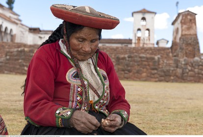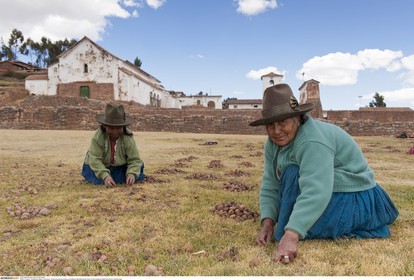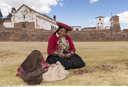 PERU / Cusco / Urubamba Valley / Chinchero / Quechua woman sorting out potatoes with Monserrat church in the background..© Oliver Bolch / Anzenberger Perou *** Peru