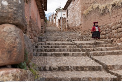 PERU / Cusco / Urubamba Valley / Chinchero / Quechua woman on stairs..© Oliver Bolch / Anzenberger Perou *** Peru