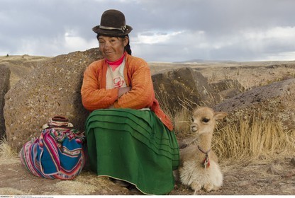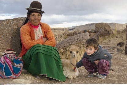 PERU / Puno / Sillustani / Quechua woman with Llama and tourist child..© Oliver Bolch / Anzenberger Perou *** Peru