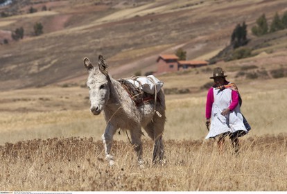 PERU / Cusco / Urubamba Valley / Maras / Quechua woman with donkey walking through the fields..© Oliver Bolch / Anzenberger Perou *** Peru