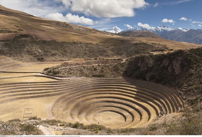 PERU / Cusco / Urubamba Valley / Maras / Archaeological Park Moray / Experimental farming terraces of the Incas with Cordillera Urubamba with Nevada Veronica (5682 m) in the background..© Oliver Bolch / Anzenberger Perou *** Peru
