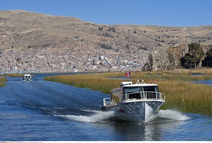 PERU / Puno / Lake Titicaca / Boat on lake with Puno in background..© Oliver Bolch / Anzenberger Perou *** Peru