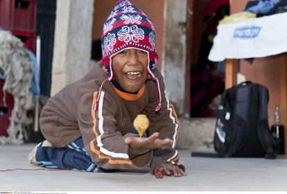 PERU / Puno / Lake Titicaca / Amantani Island / Quechua boys playing with spinning top..© Oliver Bolch / Anzenberger Perou *** Peru