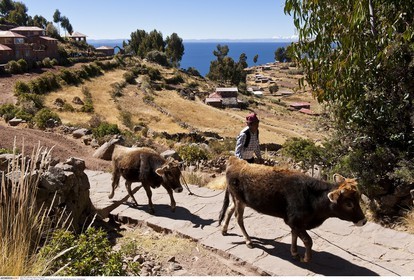 PERU / Puno / Lake Titicaca / Taquile Island / Quechua man with cattle..© Oliver Bolch / Anzenberger Perou *** Peru