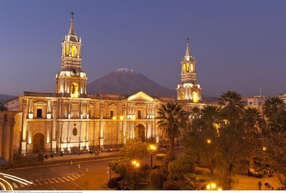 PERU / Arequipa / Historic town / Plaza de Armas / Basilica Cathedral of Arequipa with volcano Misti in background at dusk..© Oliver Bolch / Anzenberger Perou *** Peru