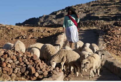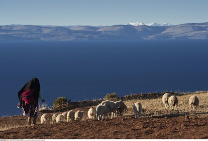 PERU / Puno / Lake Titicaca / Amantani Island / Quechua woman with sheep..© Oliver Bolch / Anzenberger Perou *** Peru