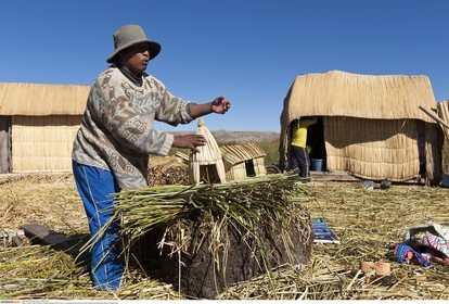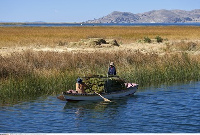 PERU / Puno / Lake Titicaca / Floating islands of the Uros / Uro woman harvesting reed..© Oliver Bolch / Anzenberger Perou *** Peru