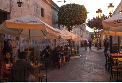 PERU / Arequipa / Historic town / Plaza de Armas / Paseo de la Catedral / Pedestrian lane with bars and restaurants at dusk..© Oliver Bolch / Anzenberger Perou *** Peru