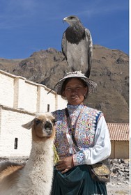 PERU / Arequipa / Colca Canyon / Maca / Quechua woman in traditional dress with Llama and Eagle in front of colonial church..© Oliver Bolch / Anzenberger Perou *** Peru