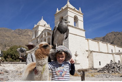 PERU / Arequipa / Colca Canyon / Maca / Tourist child with Llama and Eagle in front of colonial church..© Oliver Bolch / Anzenberger Perou *** Peru