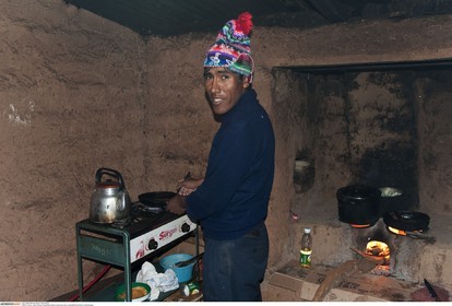 PERU / Puno / Lake Titicaca / Amantani Island / Quechua man cooking..© Oliver Bolch / Anzenberger Perou *** Peru