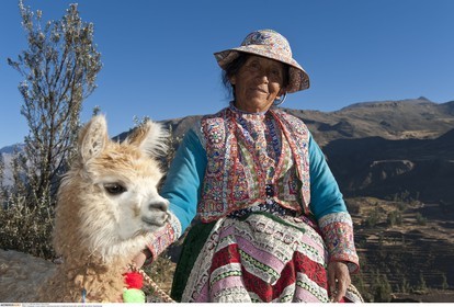 PERU / Arequipa / Colca Canyon / Quechua woman in traditional dress with Llama..© Oliver Bolch / Anzenberger Perou *** Peru