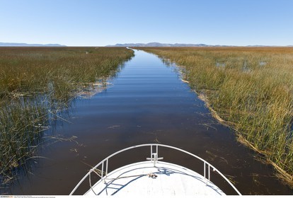 PERU / Puno / Lake Titicaca / Boat driving through reed-belt..© Oliver Bolch / Anzenberger Perou *** Peru