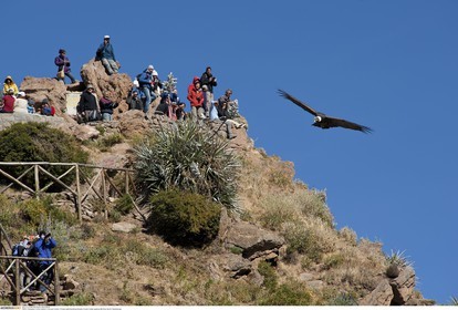 PERU / Arequipa / Colca Canyon / Cruz del Condor / People watching flying Andean Condor (Vultur gryphus)..© Oliver Bolch / Anzenberger Perou *** Peru