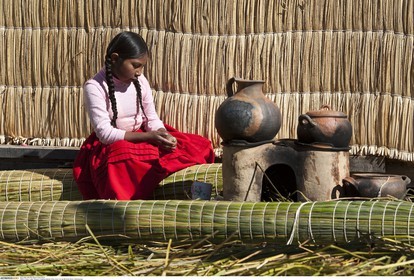 PERU / Puno / Lake Titicaca / Floating islands of the Uros / Uro girl..© Oliver Bolch / Anzenberger Perou *** Peru
