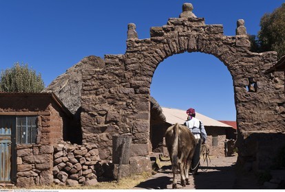 PERU / Puno / Lake Titicaca / Taquile Island / View through stone arch ..© Oliver Bolch / Anzenberger Perou *** Peru