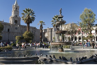PERU / Arequipa / Historic town / Plaza de Armas / Fountain and Basilica Cathedral of Arequipa..© Oliver Bolch / Anzenberger Perou *** Peru
