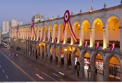 PERU / Arequipa / Historic town / Plaza de Armas / Arcade Bolognesi at dusk..© Oliver Bolch / Anzenberger Perou *** Peru