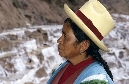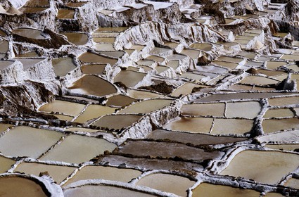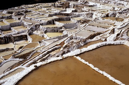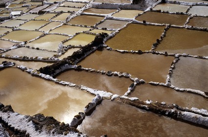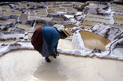 • PERU / Cusco / Urubamba Valley / Maras / Salineras de Maras / Salt extraction from salty river at salt evaporation ponds