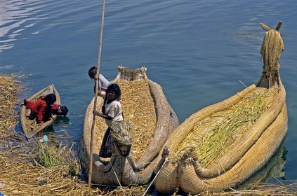 • PERU / Puno / Lake Titicaca / Floating islands of the Uros / Uro woman harvesting reed