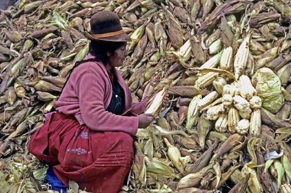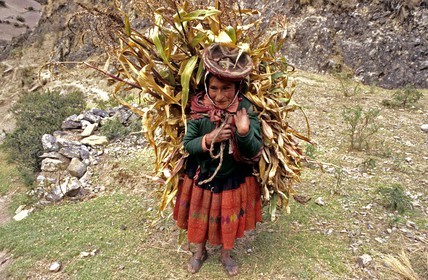 • Peru, Ollantaytambo, Willoc community, woman harvest corn