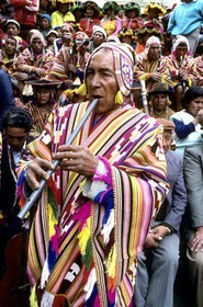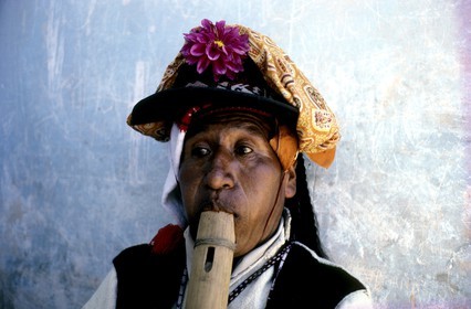 • PERU / Puno / Lake Titicaca / Taquile Island / Quechua man playing music during Carnival