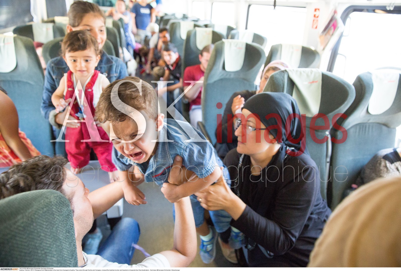 | Description | Austria / Vienna / 2015 / Refugees in the train from Hungary to Austria. ..They came through Serbia and Hungary, crossed the Austrian border and travelled on towards their final destination - Germany...© Georges Schneider / Anzenberger |