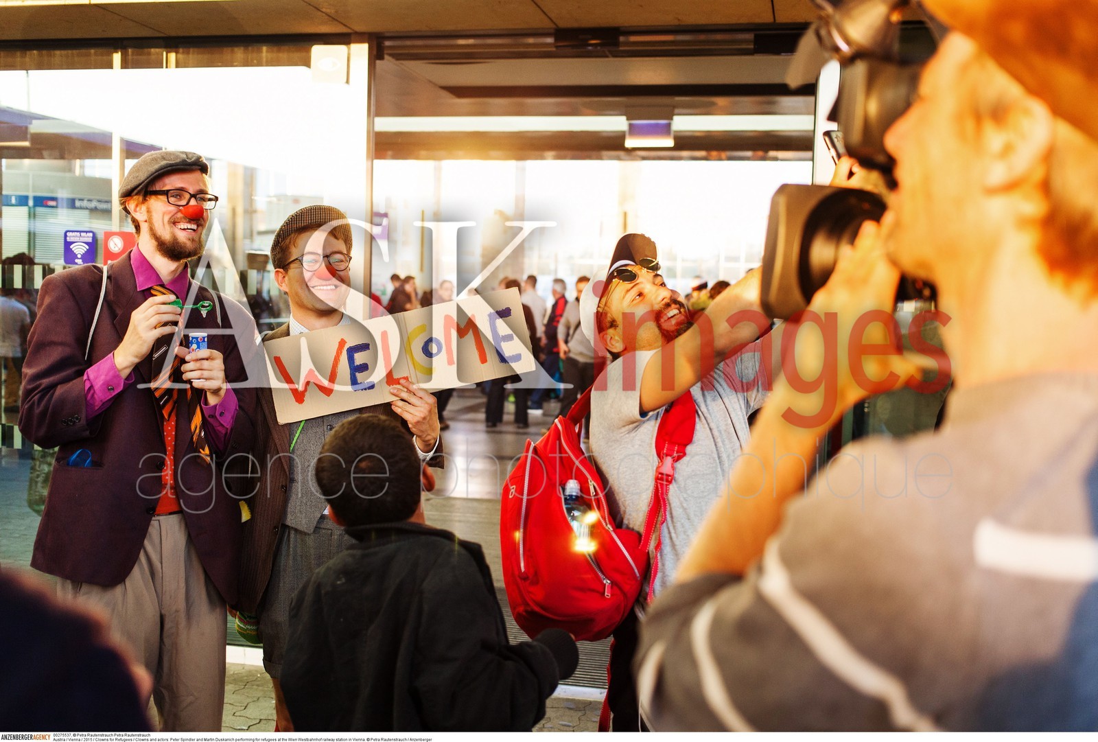 | Description | Austria / Vienna / 2015 / Clowns for Refugees / Clowns and actors: Peter Spindler and Martin Duskanich performing for refugees at the Wien Westbahnhof railway station in Vienna..© Petra Rautenstrauch / Anzenberger/ASK Images |